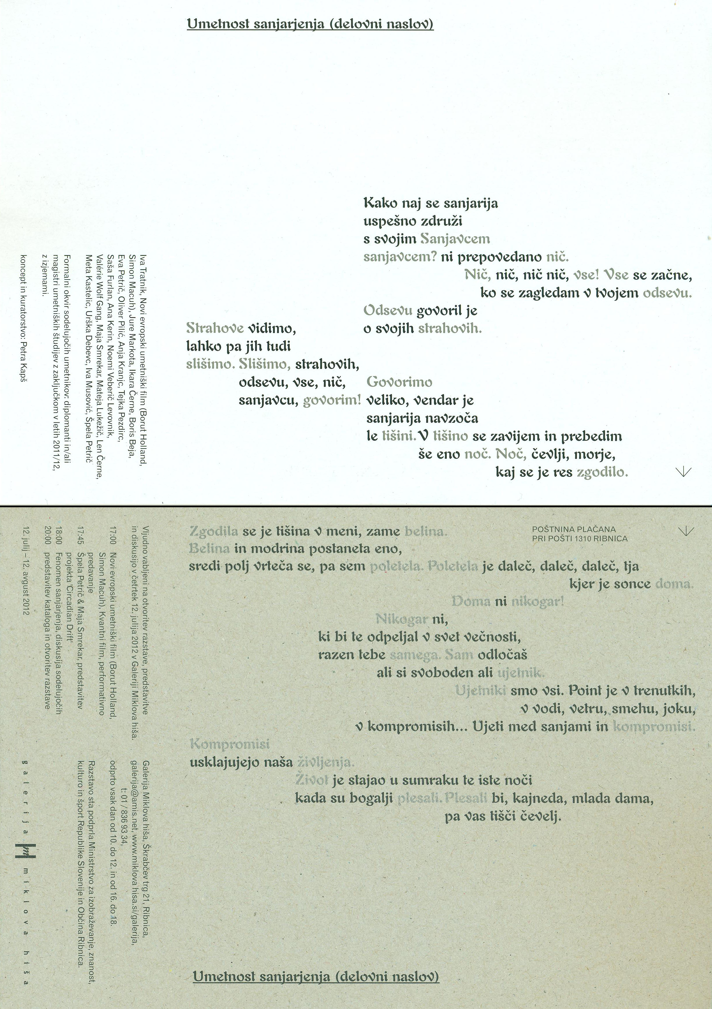 artists: Iva Tratnik, Borut Holland, Simon Macuh, Jure Markota, Ikara Černe, Boris Beja, Eva Petrič, Oliver Pilić, Anja Kranjc, Tejka Pezdirc, Saša Furlan, Ana Kerin, Noemi Veberič Levovnik, Valérie Wolf Gang, Maja Smrekar, Mateja Lukežič, Len Černe, Meta Kastelic, Urška Debevc, Iva Musović, Špela Petrič
