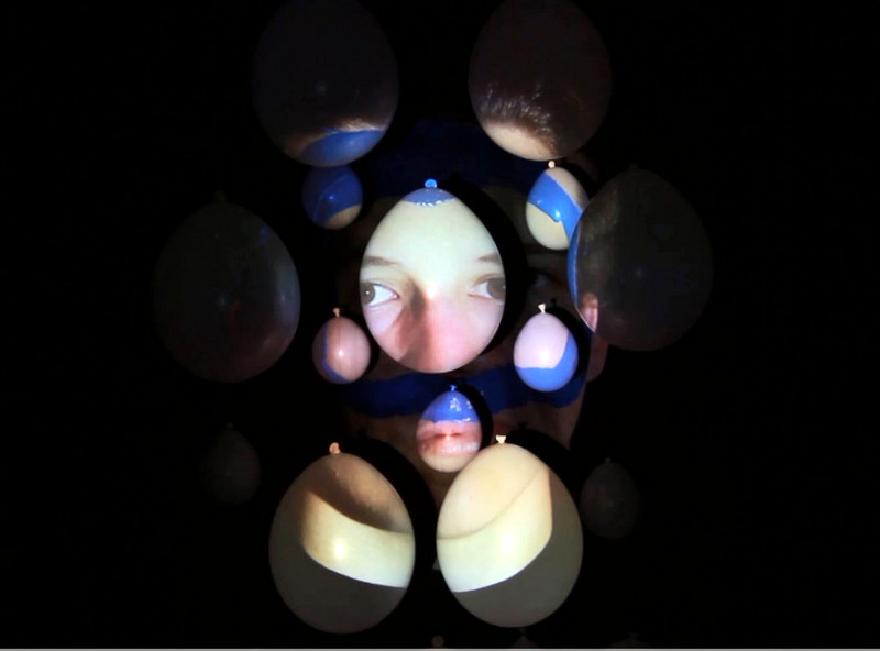 Dali’s blue is video installation by Valerie Wolf Gang inspired by the Salvador Dali’s picture Galatea of the Spheres. In the video Valerie is painting the face of a young man blue and the video is projected on white balloons suspended from the ceiling. Balloons are set in different layers so the projection becomes three dimensional in space and it degrades the video image in smaller parts which became it’s own separate videos. If you look at the projection from the frontal part you can see a young man and the painting process but if you look from other angles you can see a totally new video which can be very abstract or a very distorted person. “These small atoms, these different worlds, form love and hate and thin is the line which separates the pride from the mass destruction. In the end we are guilty for all the bad and all the good in the world. But the guilt doesn’t matter because in the end we are all just a set of atoms. Some are good, some are bad.”