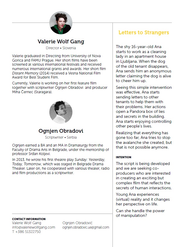 A feature film script project Letters to Strangers by Valerie Wolf Gang and Ognjen Obradović (production Staragara) was part of Torino Film Lab 2018 for script development & pitching.