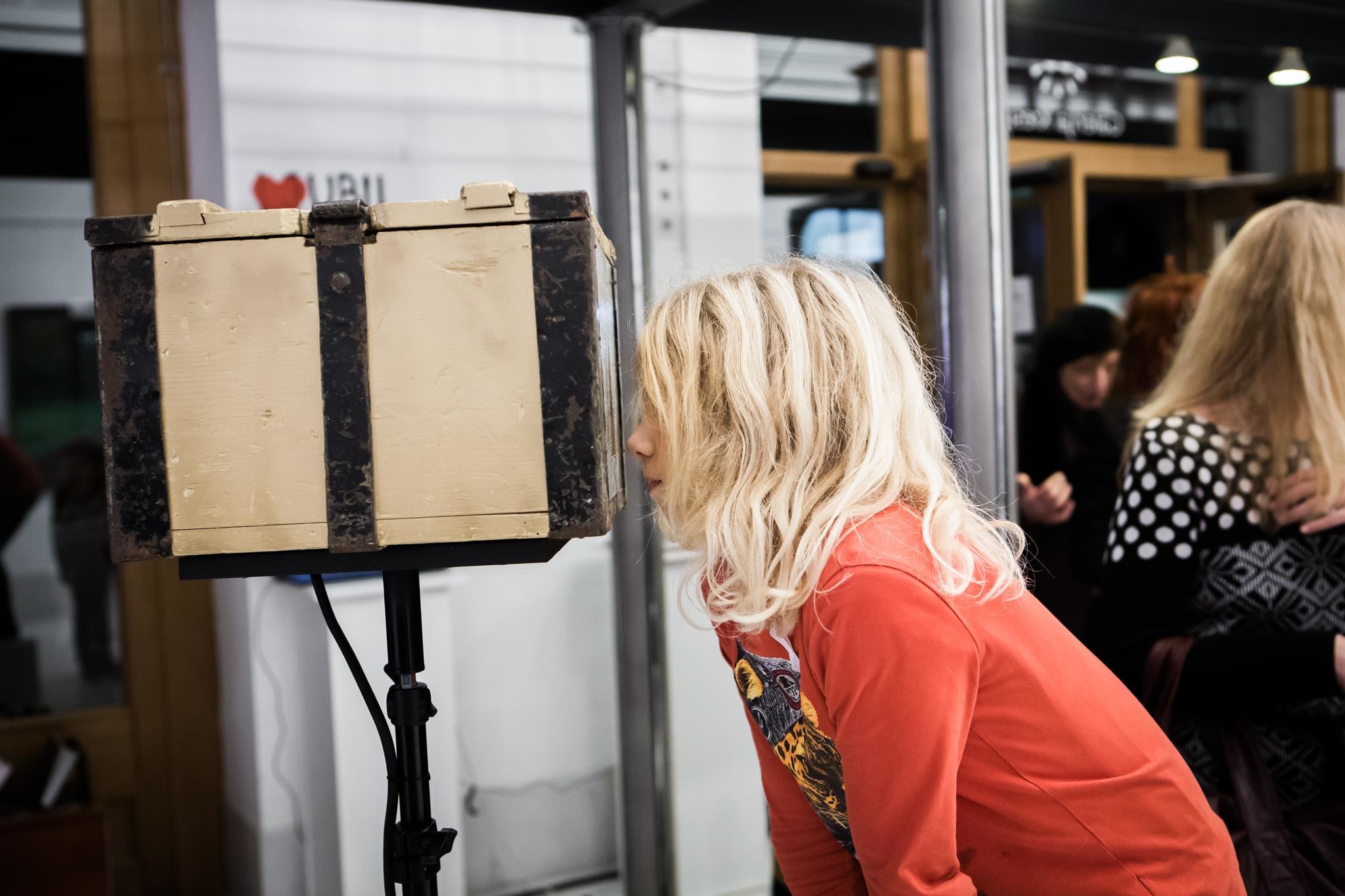 Memories in Glass is a multimedia installation with a hologram of a woman caught in a baby bottle, placed in an old, worn and partly restored military ammunition box. The hologram showing a story of a woman is a metaphor for surviving the difficult moments in a partner relationship, in which the children witnessed violence against their mother, which is symbolized specifically with a custom made baby bottle and the story inside (hologram). This is trapped in a crater, which, with its outwardly refined and partially renewed image, speaks of violence and a new beginning, while providing an intimate view of the interior and identifying it with a tragic story. The layout is accompanied by a sound image that passes from the sounds of hitting different objects to the instrumental version of the Slovenian folk song “Barčica po morju plava” which speaks about the ship crossing the ocean – a similar situation where the actual victim of the violence met her partner in real life and where the violence began.