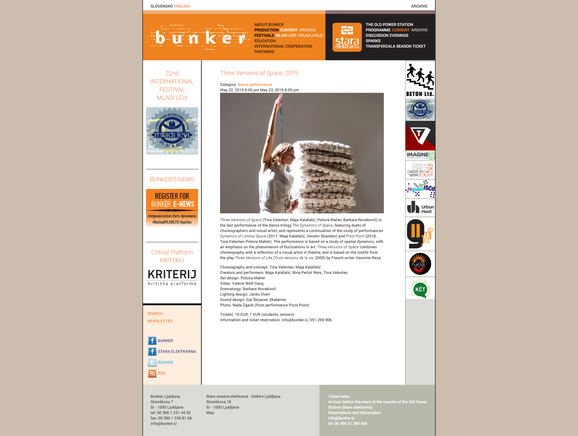 Three Versions of Space (Tina Valentan, Maja Kalafatić, Polona Maher, Barbara Novakovič) is the last performance of the dance trilogy The Dynamics of Space, featuring duets of choreographers and visual artist, and represents a continuation of the study of performances Dynamics of Liminal Space (2017; Maja Kalafatić, Venelin Shurelov) and Pivot Point (2018; Tina Valentan-Polona Maher). The performance is based on a study of spatial dynamics, with an emphasis on the phenomenon of fluctuations in art. Three Versions of Space combines choreography with a reflection of a visual artist in theatre, and is based on the motifs from the play Three Versions of Life (Trois versions de la vie, 2000) by French writer Yasmine Reza.