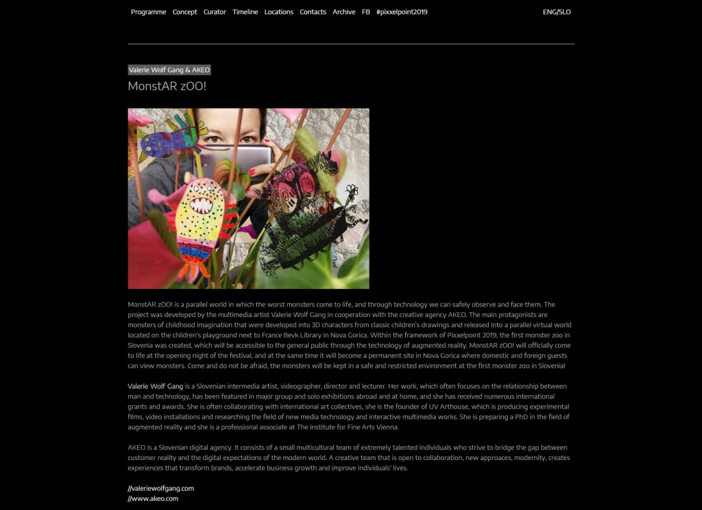 New project augmented reality interactive installation MonstAR zOO by Valerie Wolf Gang (in collaboration with AKEO Lab Creative Agency) was officially opened at the international Pixxelpoint Festival for New Media Arts in Nova Gorica.