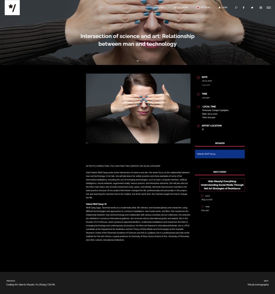 Valerie Wolf Gang was invited to give an artist talk and discuss her topics of research in the Athens Digital Arts Festival. The talk is titled an “Intersection of science and art: Relationship between man and technology”.