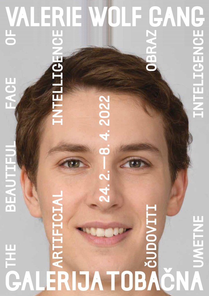 The other works on display contain a great deal of the artist’s intimate experience with technology, with Valerie Wolf Gang revealing to the visitor individual stories from the history of her research into AI, software and, above all, robotics. A video loop shows an industrial car-painting robot and her trying to humanize it by teaching it the greeting “Hello, nice to meet you!” A series of photo prints, depicting the artist’s month-long cohabitation with a robot in six acts, combines a fictional and a true story. Within the fictional narrative, the robot deviates from Asimov’s Three Laws of Robotics and gradually subjugates her – starting from the initial act of attempting to take a cup of coffee away from her. On the passepartout, her life story is written in binary code; it is an element of reality that at the same time continues her transformation from a physical to a digital body. The ubiquity of digital identities and the demand of today’s technology to redefine the human body are further explored in a graphic portrait of a fictional person. It is an AI-generated image and a database, which mined images of people recorded in public areas by surveillance cameras. It is accompanied by a video in which the artist poses questions to children about the identity of the figure they believe to be a real person and onto which they map their own identities, desires, and fears. The installation is rounded off by a collage – made up of archival images of several months of scanning her skin with a hand-held scanner – that captures moments when her body was undergoing the most significant transformation due to weight loss in the course of her collaboration with artificial intelligence. The collage is accompanied by sound and three photographs showing the complete transformation of her physical body.