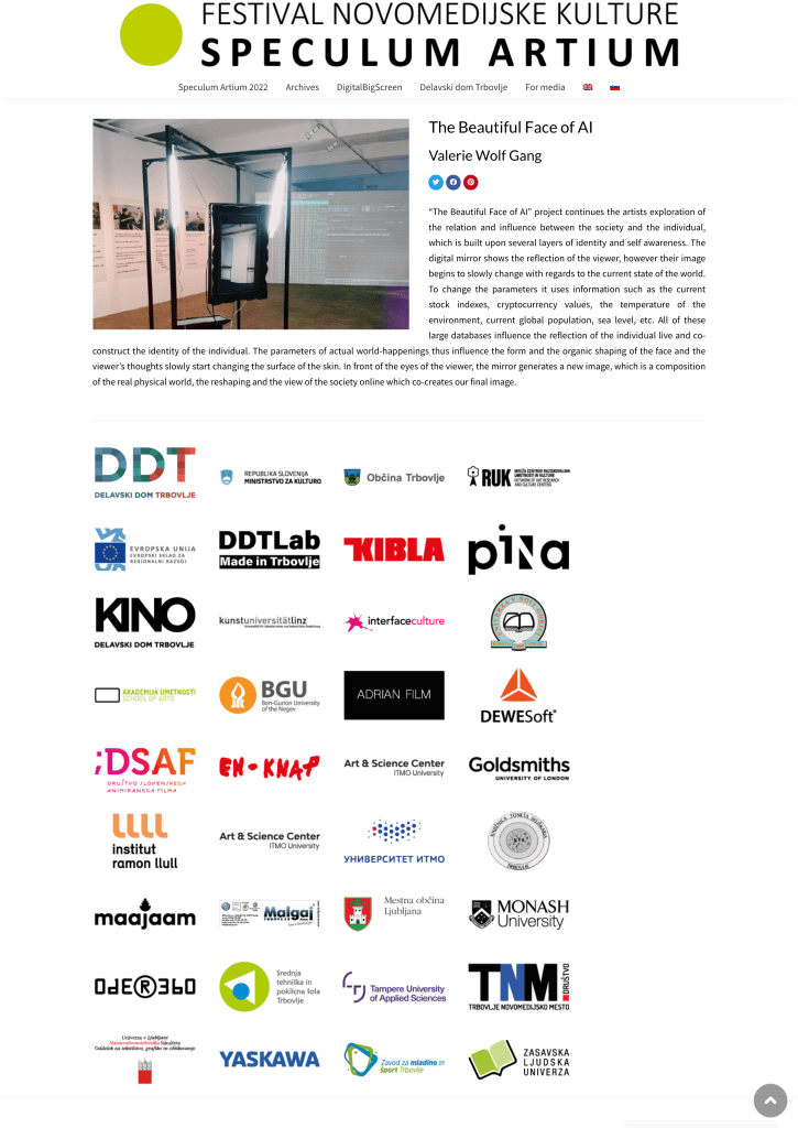 Wolf Gang’s interactive AI/XR installation “The Beautiful Face of AI” was exhibited at the International Festival of New Media Culture Speculum Artium.